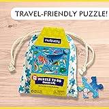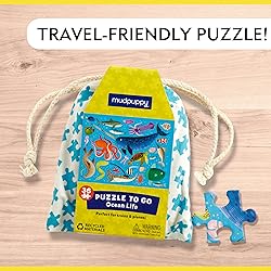 - Whether at home, in the car, on a plane, train or boat, young children will love the Mudpuppy Ocean Life Puzzle To Go featuring popular sea animals including a narwhal, octopus, stingray, sea turtle, seahorse and more. The fun 36-piece puzzle is perfect for children ages 3 and up transitioning out of jumbo puzzle pieces. The finished puzzle measures 12 x 9”, so you don’t need much space to work on it. The puzzle fits perfectly on an airplane tray! The 6. 5” x 7. 5” 100% cotton silkscreened muslin drawstring storage bag makes it easy to take with you for puzzle time on the go. The bag includes a postcard with the completed puzzle art and is an ideal place to keep pieces safe and damage-free. For over 25 years, Mudpuppy has created quality non-digital puzzles, games and toys for children and families that facilitate creative play and imaginative thinking. All Mudpuppy products adhere to CPSIA, ASTM, and CE Safety Regulations. Environmentally conscious, the puzzle greyboard contains 90% recycled paper, the packaging contains 70% recycled paper and it is printed with nontoxic inks.