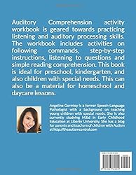 - Auditory Comprehension activity workbook is geared towards practicing listening and auditory processing skills. The workbook includes activities on following commands, step-by-step instructions, listening to questions and simple reading comprehension. This book is ideal for preschool, kindergarten, and also children with special needs. This can also be a material for homeschool and daycare lessons.