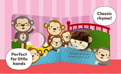 - Play along with this well-loved rhyme and an adorable monkey puppet! This classic rhyme about five energetic monkeys features a fun finger puppet toy built into the book, encouraging interactive play, hand-eye coordination, and language development in your little one. Babies and toddlers learn best when they are playing, especially when their grown-ups share in the fun!Collect the entire series in the Finger Puppet Collection!The adorable built-in finger-puppet encourages interactive finger play, which helps develop little muscles and build finger strength, improving coordination and fine motor skills. Soft plush and a rhyming story combine to provide both tactile and verbal learning opportunities to babies and toddlers.Thick board pages perfect for little hands to actively participate in storytime. Lively illustrations and a plush finger puppet help keep little girls and boys engaged throughout.Babies and toddlers learn best when they are playing, especially when their grown-ups are in on the fun.¡Colecciona toda la serie en la Colección de marionetas de dedo!La adorable marioneta integrada fomenta el juego interactivo con los dedos, lo que ayuda a desarrollar los pequeños músculos y a fortalecer los dedos, mejorando la coordinación y las habilidades motrices afinadas.Un suave peluche y un cuento en rima se combinan para ofrecer oportunidades de aprendizaje táctil y verbal a bebés y niños pequeños. Las páginas de cartón gruesas son perfectas para que las manitas participen activamente en la hora del cuento.Las ilustraciones alegres y una marioneta del dedo de felpa ayudan a mantener a los niños y niñas pequeños entretenidos durante todo el libro. Los bebés y los niños pequeños aprenden mejor cuando juegan, ¡especialmente cuando los mayores participan en la diversión!Spanish Language Edition