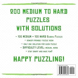 - This great book contains 100 Medium and 100 Hard Sudoku puzzlesDIFFICULTY LEVEL: Medium and Hard - a consistent grading standard for Sudoku books by Andrew M. Manovicone large puzzle on each pageanswers for sudoku puzzles are included at the end of the bookonly one solution for each puzzlebest to share with family and friends on road tripsgreat christmas gift for Sudoku loverssenior friendly puzzle bookHappy puzzling!