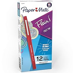 Add a blast of fun to all your writing with vivid red ink Medium Point felt tip (0.7mm) produces clear, expressive lines to match your personality Smear- and fade-resistant, so smudges are officially history Water-based ink won’t bleed through paper so your writing stays put The point guard prevents the tip from fraying, so the party never stops Includes 12 red Flair pens