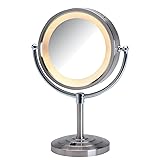 STUNNING VANITY MIRROR - This LED makeup mirror looks stunning on any vanity or bathroom counter. The pedestal style base and modern, nickel finish match a variety of home styles and aesthetics. This desk mirror features a power cord and long-lasting LED bulbs, making it an ideal choice for daily use. NEW & IMPROVED LIGHTING - These magnifying mirrors now feature LED bulbs that are long-lasting. Experience flawless makeup application and grooming with vibrant LED lighting GREAT FOR MAKEUP APPLICATION & TWEEZING - This multipurpose tabletop mirror is perfect for getting ready. With bright LED lighting and 5X magnification, this vanity mirror makes getting ready easy! SPECIFICATIONS - This magnifying mirror is perfect for any bathroom or bedroom. This 8.5-inch diameter mirror features 5X and 1X magnification, making it ideal for shaving, grooming, makeup application and more! The tabletop mirror stands 15.5 inches tall and has a lightweight base for easy mobility. Jerdon makeup mirrors are trusted by spas and hotels around the world. Protected under a 1-year warranty