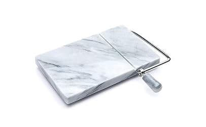 - Serving a delicious cheese platter at your next gathering will add a touch of class while savoring all of your guests' taste buds at the same time. This attractive White Marble Cheese Slicer is perfect for your next occasion! Slice both hard and soft cheeses quickly and cleanly with the durable stainless steel wire, while the marble base keeps the cheese at a nice, cool temperature. Foam feet elevate the board providing protection for your kitchen counter top and table. The cheese slicer comes with two replacement wires to ensure long-lasting use. Hand washing recommended to keep your slicer looking brand new. Create uniform slices every time and be the best host on the block with this marble cheese slicer!