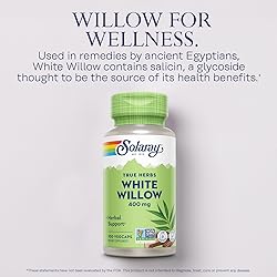 WHITE WILLOW BARK CAPSULES - White Willow bark is known for its natural, supportive properties. The bark of the tree contains salicin, a naturally occurring compound NATURAL HERBAL SUPPORT - White Willow has long been used as a natural herbal supplement to support overall wellness, offering a plant-based approach for men and women looking for gentle daily support 400 MG PER SERVING - Our supplement provides 400 mg of White Willow per serving. Ingredients include White Willow (bark), vegetable cellulose capsule and organic rice extract blend SUGGESTED ADULT USE - Use only as directed. Take 1 VegCap three times daily with a meal or glass of water. Our supplement is vegan and non-GMO BACKED BY DECADES OF EXPERTISE - With over 50 years in supplements, Solaray combines tradition and innovation to deliver high-quality supplements you can trust for your health journey