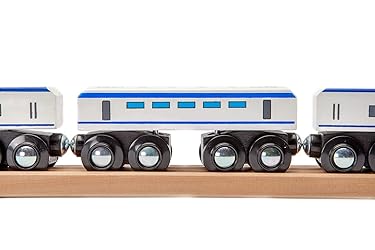 Sleek Modern Express Train Set - Add this remarkable design to your toy train set. It's the ultimate Express Train made of genuine hardwood. Every child will immediately want to play with this. It's fast, fun, and encourages hours of creativity and imagination. This will immediately enrich your little engineer's experience. 2 Engines for Both Directions - Amazing set includes 2 toy Express Train engines allowing the train to move forward or backward. Carefully carved with slanted body shape to glide through the countryside at blazing speed. The sturdy plastic wheels allow for smooth, reliable operation. Reflective metallic hubcaps catch the light for a dazzling effect. Modern Passenger Car - Business people, dignitaries, and lots of kids travel inside this elite passenger car that reaches its destinations in record time. This ultra modern set adds a current feeling to retro wooden train sets. It's the essential add-on accessory to bring your train set into the 21st Century. Don't leave this page without getting one. Fully Compatible with All Major Brands - We make this Express Train Set to be compatible with all quality wooden trains. It's Thomas and Friends, BRIO, and Melissa and Doug compatible. Simply place on your track and begin enjoying. Ideal for hours of fun with siblings and friends from the neighborhood. Everyone will want their turn pushing this train around the track. Great Gift Idea - This makes a thrilling gift for birthday or Christmas. Perfect for both boys and girls. Many people are stocking up with 2 of these to give their set an impressive modern feel built for speed. Get yours while we have this special train set in plentiful supply. It's selling fast and is a favorite for kids everywhere.