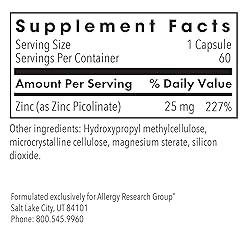 Immune Support Supplement: Allergy Research Group Zinc Picolinate supports a healthy immune system and cellular function with bioavailable zinc picolinate for daily nutrition* Cellular & Enzyme Function: Provides 25 mg of zinc to support enzyme activity, antioxidant pathways and essential trace mineral needs for overall wellness* Bioavailable Zinc Picolinate: Highly absorbable zinc in vegetarian capsules to support metabolism, growth and repair and help maintain hair, skin and nail health* Highest Purity Standards: This supplement is free from gluten, dairy, soy, corn, nuts, egg, shellfish, fish, sesame and yeast Solutions Backed by Science: Allergy Research Group and its family of brands—Metabolic Maintenance, MethylPro, Nutricology and Optimox—have delivered trusted supplements for more than 45 years