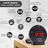 - Wake up to the Sonic Bomb’s Most Powerful Bed Shaker. The Sonic Bomb comes with a powerful bed shaker that is to wake you up. The super shake will allow you to wake without disturbing others in the household. Built-In Bright Red Pulsating Alert lights and Clear Large Display. Customize how you wake up with a combination of lights, sound, and vibration and never be late again! Display too bright, there is a high/low dimmer switch to adjust the brightness. Easy to Set Dual Alarms with Adjustable volume and Tone. Set separate alarms to wake at your convenience and is also useful for the individuals on different schedules.