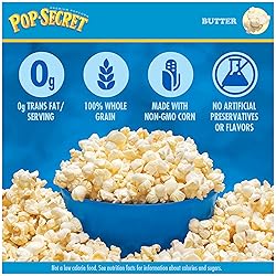 Classic buttery popcorn with the perfect balance of buttery flavor and salt 100% whole grain; non-GMO corn, 0g trans fat A great buttery snack for movie night, TV watching, family game time, or anytime! Delicious warm popcorn with an irresistible aroma and flavor, ready in minutes Three (3) shareable microwave popcorn bags per box