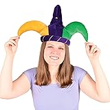 - Beistle Plush Jester Hat – 1 Count Bring bold color and classic carnival flair to festive celebrations with this eye-catching plush jester hat designed to make a statement in any crowd. Featuring a traditional three-point jester silhouette, this hat showcases rich purple, green, and gold velvet-style fabric for a vibrant, high-contrast look that instantly evokes classic masquerade and festival aesthetics. Each extended point is finished with a small metallic bell that adds subtle movement and visual interest without overwhelming the design. Designed as a one size fits most adults accessory, this plush jester hat offers a comfortable fit while maintaining its structured shape throughout extended wear. The soft fabric construction provides a lightweight feel, making it suitable for themed gatherings, parade participation, novelty photo setups, or decorative display use. Pair this jester hat with coordinating Beistle décor, masks, beads, and accessories to create a cohesive and visually striking celebration environment. GENERAL USE ITEM: This item is a general-use product intended for decorative or novelty use by adults.