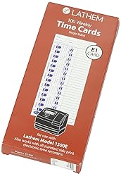 - Increased card width for easier insertion. In/Out indicators on outside edge for more accurate print alignment. Gross to net payroll deduction area. Employee signature line for verification of time worked. Single-sided with named days Monday-Sunday. Global Product Type: N/A; OEM Card Number: N/A; Clock/Recorder Compatibility: Lathem Time Model 900E; Lathem Time Model 1000E; Lathem Time Model 1500E; Lathem Time Model 5000E; Size: 4 X 9.