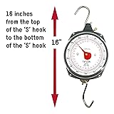 This hanging scale has a capacity of up to 70-pounds (32-kilograms), making it suitable for a variety of personal or commercial applications. High-visibility graphics are easy to read from almost any angle. A bright red pointer allows for quick, at-a-glance measurements. Tough, stainless steel construction resists rust and corrosion. S-hooks are included to for ease of hanging.