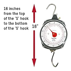 - The Taylor Dial Style 70-Pound Industrial Hanging Scale is compact, portable and highly accurate. This hanging scale has a capacity of up to 70-pounds (32-kilograms), making it suitable for a variety of personal or commercial applications. High-visibility graphics are easy to read from almost any angle. A bright red pointer allows for quick, at-a-glance measurements. Tough, stainless steel construction resists rust and corrosion. S-hooks are included to for ease of hanging.