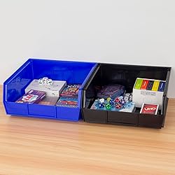 MULTI-PURPOSE STORAGE BINS: These stackable storage bins hold up to 50 pounds and are great for closet organization, classrooms, garage storage, pantries, craft storage, bathrooms, and more; Use them to store snacks, toys, or as a tool organizer DURABLE ORGANIZATION: Crafted from heavy-duty, one-piece industrial plastic, these bins are rust, water, and corrosion-proof; Reinforced side ribs add strength and prevent spreading; Each storage bin is easy-to-clean and can be used indoors or outdoors SPACE-SAVING DESIGN: These stackable plastic bins maximize storage space and keep your items neatly organized; Extra-wide stacking ledge provides stability, saves space and prevents spills; Anti-slide stop prevents stacked bins from shifting forward CUSTOMIZABLE ORGANIZATION: Optional dividers and label holders (sold separately) let you tailor the heavy duty storage bins to your specific needs for any project or space; They also can be used with louvered panels or rail racks (sold separately) STACKING BIN DIMENSIONS: Outside Dimensions - 10-7/8" x 11" x 5"; Inside Dimensions - 10-1/4" x 10" x 4-3/4"; Curved-bottom hopper front makes it easy to retrieve small parts; Proudly made in the USA