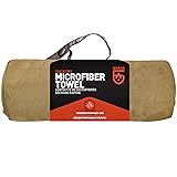 Microfiber Imported Dry off quickly when camping or swimming with this super absorbent microfiber towel that includes a snap loop for easy hanging while hiking, backpacking, or traveling Select medium, large, or XL for a compact and lightweight towel that packs to the size of a water bottle, weighing under 12 oz Keep towel fresh longer between washes since the microfiber is treated to reduce bad smells; use it for sports, fitness, yoga, and exercise Pack in the dual-pocket storage bag along with your toiletries or sunscreen and bring it to the beach, pool, or gym Packaging may vary