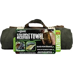 100 % Microfiber Imported Dry off quickly when camping or swimming with this super absorbent microfiber towel that includes a snap loop for easy hanging while hiking, backpacking, or traveling Select medium, large, or XL for a compact and lightweight towel that packs to the size of a water bottle, weighing under 12 oz Keep towel fresh longer between washes since the microfiber is treated to reduce bad smells; use it for sports, fitness, yoga, and exercise Pack in the dual-pocket storage bag along with your toiletries or sunscreen and bring it to the beach, pool, or gym Packaging may vary
