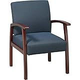 - Guest chair offers a thick padded seat and back with built-in lumbar support. Base and arms are made of wood. Easily assemble chair using the chair's unique locking system. Assembly requires no tools.