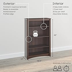 Prepac Sonoma 4-Tier Bookcase 48"H with 3 Adjustable Shelves, Espresso Storage Cabinet, Modern Display Cabinet, Bookshelf with Storage Shelves for Home Office, Living Room, Bedroom Organizer