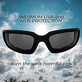 MEETS INDUSTRY SAFETY STANDARDS- Shatterproof, scratch-resistant polycarbonate lenses and foam-padded soft-touch frames meet ANSI Z87.1 safety standards SUPER LIGHT PADDED FRAMES YOU HARDLY FEEL- Ultralight full frame glasses complete with soft-touch frames, rubber ear pads, and thick EVA foam padding for lightweight comfort and durability AERODYNAMIC DESIGN- Curved perfectly to contour your face and protect your eyes from wind, dust, and debris MAXIMUM UVA and UVB PROTECTION- Lenses provide 100% UVA and UVB protection from the suns harmful rays SOFT-TOUCH FRAMES- Enjoy a velvety soft frame you'll love to touch