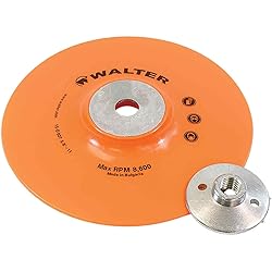 Disc Backing Pad: this back pad is manufactured for supporting sanding discs and making them flexible. It can be ideally used with 7 in. Coolcut and Topcut resin fiber sanding discs from Walter Durability: the sanding disc pad is manufactured from sturdy plastic — suited for heavy-duty industrial finishing procedures Functions: the plastic backing is suitable for use in the fast weld removal and fine blending of metallic surfaces. Flexibility provided by the pad ensures smooth finishing on curved surfaces Heat Dissipation: this flexible disc pad safely dissipates heat and helps enhancing the life of fiber sanding disc. It efficiently works at maximum rotational speed of 8600 RPM Specifications: the backing pad assembly measures 7 in. in diameter and weighs 7.8 oz. Orange color makes it easily identifiable