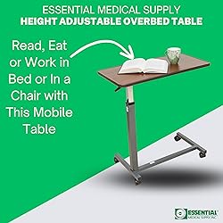 - The Essential Medical Supply Height Adjustable Automatic Overbed Table is a perfect addition to any hospital or home setting. With its woodgrain top and locking wheels, this table provides easy access and convenience for adults and seniors. Designed with adjustable height capabilities from 30in to 42.5in, this overbed table can be easily adjusted to fit any bed or bedside. The woodgrain top with a raised lip features a sturdy 15in x 30in construction which allows for stability while working on the desktop surface. The locking wheels also ensure that the table stays in place during use, providing added safety for users. Whether it's used as a desk for work or as a convenient tray for meals, this overbed table is an essential piece of furniture that combines functionality with style.