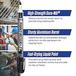 HIGH QUALITY PERMANENT MARKER: Unsurpassed marking performance on oily, wet, soapy, or coated surfaces; performs reliably in extreme temperatures from -50 F to 150 F (-46 C to 66 C). FAST-DRYING AND VIBRANT COLOR: Fast-drying paint resists wear and fading; rich, bold color stands out on most surfaces for clear visibility and easy identification. HEAVY-DUTY ALUMINUM BARREL: Durable aluminum barrel and nib reduce breakage for a longer marking life, while the easy-to-grip clip-cap allows for convenient pocket storage. VERSATILE SURFACE COMPATIBILITY: Works effortlessly on metal, aluminum, pipes and tubes, plastic, rubber, and tires. MADE IN USA: Made in the USA with xylene-free paint to minimize health risks and ensure safer use in industrial environments.