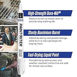 Marks with real paint, dries in 3 minutes Long-lasting weather, water and UV-resistant Marks with better, brighter coverage compared to ink markers Marks on all surfaces including: metal, wood, glass, plastic, rubber, cardboard and paper Durable 1/8" thick nib permits fineline marking or bold Improved "flowmatic" valve releases paint on-demand for smooth and continuous use