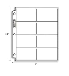 - Ultra-Pro 8-Pocket Pages ) ... Coupon Page (page was designed to hold cards measuring 2 3/4" x 3 1/2"). . Pages are clear on both sides. Sheet size: 8" x 11 1/2". Pocket size: 3 15/16" x 2 3/4". Archival Quality. Acid Free. PVC Free. Super Clear. Very Strong. Pre-punched holes. These pages fit in our standard-size albums and other 3-ring binders