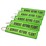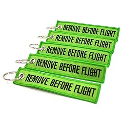 - REMOVE BEFORE FLIGHT Keychains are 100% embroidered, with merrowed borders. Keyring is nickel plated for long lasting durability. Help yourself keep track of your keys with our Lime Green "Remove Before Flight" keychain. The keychain is 12.5cm long and 2.5 wide, and the letters are embroidered in black thread.