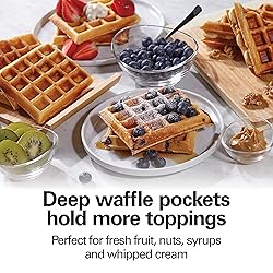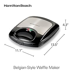MAKES 4 WAFFLES AT ONCE: With the Hamilton Beach Belgian-Style Waffle Maker, you'll have 4 crispy, delicious waffles ready to serve with your favorite toppings in just 5 minutes DEEP WAFFLE POCKETS HOLD MORE TOPPINGS: Make thick Belgian-style waffles that have deep pockets for fillings like berries and fresh fruit, nuts, syrups and whipped cream ELIMINATE GUESSWORK: Indicator lights on top of the waffle iron show you when power is on and when it’s hot enough to add batter EASY TO CLEAN: Food won't stick to the nonstick grids on the Belgian waffle maker, and a covered hinge and a batter channel help prevent messy spills LOOKS GREAT IN THE KITCHEN: The black and stainless steel exterior looks great on any countertop and will complement your other kitchen appliances