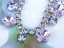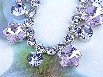 Make a statement. This delicate floral necklace set is the perfect subtle statement piece. It features beautiful, dainty hibiscus flowers, paired with small and large circles, for a mixed look of floral and geometric style. The crystal rhinestones are attached to a flat metal chain. The chain is adjustable, and allows you to wear the necklace from a high, almost choker style, to a lower scoop neck length Beautiful purple crystals. This glamorous necklace and earring set features gorgeous purple rhinestones. The flowers feature lighter, violet crystals, while both circle sizes feature a tanzanite colored crystal rhinestone. These chic colors pair perfectly with the silver toned metal of the chain and stone settings Add a touch of elegance. This sparkling necklace and earring set can be used for practically any occasion. The sparkling, varied purple toned rhinestones, paired with the silver tone metal, make a versatile jewelry piece. Wear with a semi formal outfit, or workplace attire to add some flair, or pair with a fancier look for an evening out Adjustable chain. The earrings feature a flat metal chain with crystal rhinestones, providing versatility in wearing styles. Adjust the length from a high, almost choker style to a lower scoop neck length, allowing you to customize the look to complement your outfit. Premium craftsmanship. Crafted with attention to detail, these earrings showcase beautiful light amethyst, lavender, and lilac crystals, adding a touch of glamour and charm. The intricate design and Premium materials make these earrings a standout piece of jewelry.