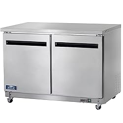 - The Arctic Air AUC48R undercounter refrigerator has a heavy-duty worktop surface that can be removed if it is not needed. Without the top panel, the overall height is reduced by 1.5 inches so it can fit under shorter countertops. This model also includes four 3-inch-diameter casters, so the unit can be moved for cleaning and maintenance, and two of these castors lock to keep the unit in place when in use. Two epoxy-coated wire shelves are adjustable to accommodate a variety of product sizes. The Arctic Air AUC48R undercounter refrigerator cabinet is accessed through two solid doors that are equipped with recessed handles, locks, and removable magnetic gaskets. These doors are self-closing, though they stay open at 90 degrees for stocking and cleaning the cabinet. Its exterior is stainless steel on the front and sides, while the interior is lined with white ABS plastic and has a stainless steel floor. Item Details: 12 cu.-ft. interior spaceSolid doors include recessed, foamed-in-place handles and locksUsers can remove magnetic door gaskets without toolsSelf-closing door stays open at 90 degreesSelf-contained, capillary tube system uses CFC-free R600a refrigerantTemperature holding range: 33-41 degrees FLarge fan motors and blades quicken temperature recoveryInternal temperature controlled with an Electronic thermostat controls internal temperatureExternal digital display monitors cabinet temperatureCondensate pan's heating element evaporates water, eliminating the need for a floor drain