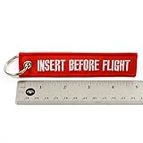 - Help yourself keep track of your keys with our \"Insert Before Flight\" keychain. The keychain is 12.5cm long and 2.5 wide, and the letters are embroidered in white thread.