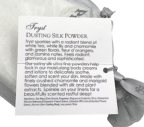 Lady Primrose Tryst Diamond Dusting Silk Pouch consists of finely crushed chamomile and marigold flowers blended with silk and plant extracts to create a naturally absorbent powder that softens, soothes and protects while delicately perfuming the skin. A sheer and silky finishing touch for you or your linens, a fragrant powder refill for the Lady Primrose Tryst Diamond Dusting Silk Shaker.Lady Primrose's signature fragrance, Lady Primrose Tryst is opulent, mysterious and elusive. Abounding with intense green florals, fleur d'orangery and jasmine, Lady Primrose Tryst offers all the romance and splendor of a secret encounter.Fragrance Notes: Top: Fleur d'Orangery; Middle: White Jasmine; Base: Lily/White Florals.