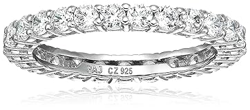 STYLE: Classic eternity band style ring featuring 2.5mm round cubic zirconia stones is stunning on its own or stacks beautifully with other rings; ring size 8 MATERIAL: Crafted in sterling silver that is hypoallergenic and nickel and lead free; set with cubic zirconia gemstones DETAILS: 850 platinum plating added to enhance design and appearance CARE: Store in a cool, dry place and limit exposure to extreme temperatures and household cleaning products; clean with a soft cloth and warm soapy water