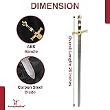 MAJESTIC DESIGN INSPIRED BY KING SOLOMON: Immerse yourself in the rich symbolism of King Solomon with a meticulously crafted replica longsword featuring intricate laser etchings on a mirror-polished 440 stainless steel blade. The golden-plated guard showcases Lions of Judah, embodying the lineage of Solomon, his father David, and Jesus of Nazareth. SYMBOLIC CROSSGUARD WITH MENORAH AND ARC OF THE COVENANT: The crossguard boasts a Menorah and an image of figures carrying the sacred Arc of the Covenant, positioned above a Star of David. This elaborate design pays homage to Solomon's role in building the First Temple in Jerusalem. The faux leather-gripped handle with gold accents and Star of David pommel adds an extra layer of sophistication. INTRICATE SCABBARD DESIGNS DEPICTING SOLOMON'S LEGACY: The scabbard's chafe features an ornate depiction of the Queen of Sheba's visit to Solomon, surrounded by her gifts. The locket showcases detailed etchings, enhancing the overall aesthetic. Choose from three handle colors (Black, Blue, and Red) to match your preference and style. COMPLETE YOUR COLLECTION WITH MATCHING DAGGER: Elevate your display with a matching dagger to complement your King Solomon Medieval Crusader Replica Longsword. Ensure your set is complete and visually stunning, capturing the essence of Solomon's wisdom and the golden age of the Kingdom of Israel. HISTORICAL SIGNIFICANCE ACROSS ABRAHAMIC FAITHS: Embrace the historical legacy of King Solomon, the third king of the unified Kingdom of Israel. With a reign considered the golden age, Solomon's wisdom resonates across Judaism, Christianity, and Islam. This replica, available with a free leather-wrapped wood scabbard, is a timeless tribute to a revered figure, making it a must-have for collectors and enthusiasts alike.