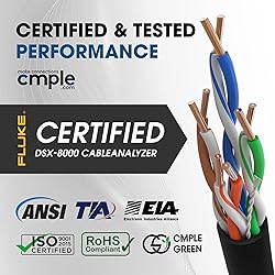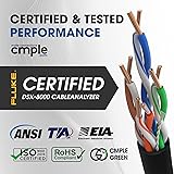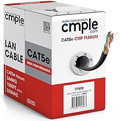 - Cat5e Plenum cable for areas with airflow, such as drop ceilings and between raised floors. It is also suitable for Riser-rated installations, including within walls, between floors, and risers. Built with high-quality FRPVC, it minimizes flame spread and produces less toxic smoke. The cable is insulated with FEP for improved performance at higher temperatures, with a maximum length of 328 feet (100 meters). Easily connects with unshielded Cat5e keystone jacks and RJ45 connectors. Cmple Cat5e bulk cable supports high-speed data transfers from 10 to 1000 Mbps (1 Gigabit) with bandwidth capabilities up to 350 MHz over 328 feet. It's ideal for powering devices like PoE (Power Over Ethernet) systems, computers, routers, IP cameras, switches, keystone jacks, RJ45 connectors, modems, gaming consoles (Xbox, PlayStation), Apple TV, Ethernet adapters, fax machines, smart TVs, mesh networks, access points, CCTV setups, and more. With the IEEE 802.3bz standard, it can achieve speeds up to 5Gb over shorter distances (2.5GBase-T and 5GBase-T). This cable meets ANSI/TIA, and U.S. safety standard. The product includes 1000 feet (305 meters) of Ethernet cable in a Tangle-Tree pull-out box, allowing you to pull out just the length you need for shorter cable runs while keeping the rest protected. Constructed with heavy-duty 24 AWG wiring, it offers enhanced durability and lower electrical resistance. Features: Tangle-Free Packaged in a convenient pullout box CMP-rated plenum jacket High-performance data transfer Suitable for high-bandwidth voice and data installations 24 AWG CCA conductor Sequential footage markings for easy tracking 4 unshielded twisted pairs (UTP) Performance up to 350 MHz 1000 feet cable length