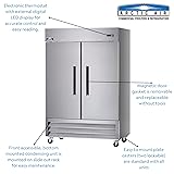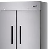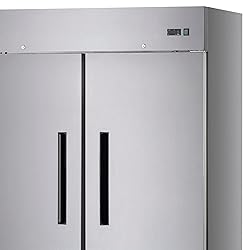 Two-section design with 49.0 cu. ft. capacity for ample storage space Electronic thermostat with digital LED display for easy temperature monitoring Two solid hinged self-closing doors with locks (field reversible) for added security Six adjustable wire shelves for customizable storage Stainless steel front and sides for durability and a sleek appearance White aluminum interior liner with stainless steel floor for easy cleaning Four 5-1/2" casters (2 locking) for easy mobility and stability Bottom mounted self-contained refrigeration with R290 Hydrocarbon refrigerant for efficient cooling Removable magnetic door gasket for easy cleaning and maintenance 754 BTU/h rejected heated air gain, 1/3 HP, 115v/60/1-ph, 4.5 amps, cord, NEMA 5-15P, cETLus, ETL-Sanitation, ENERGY STAR