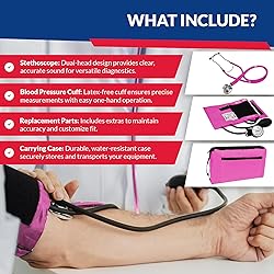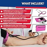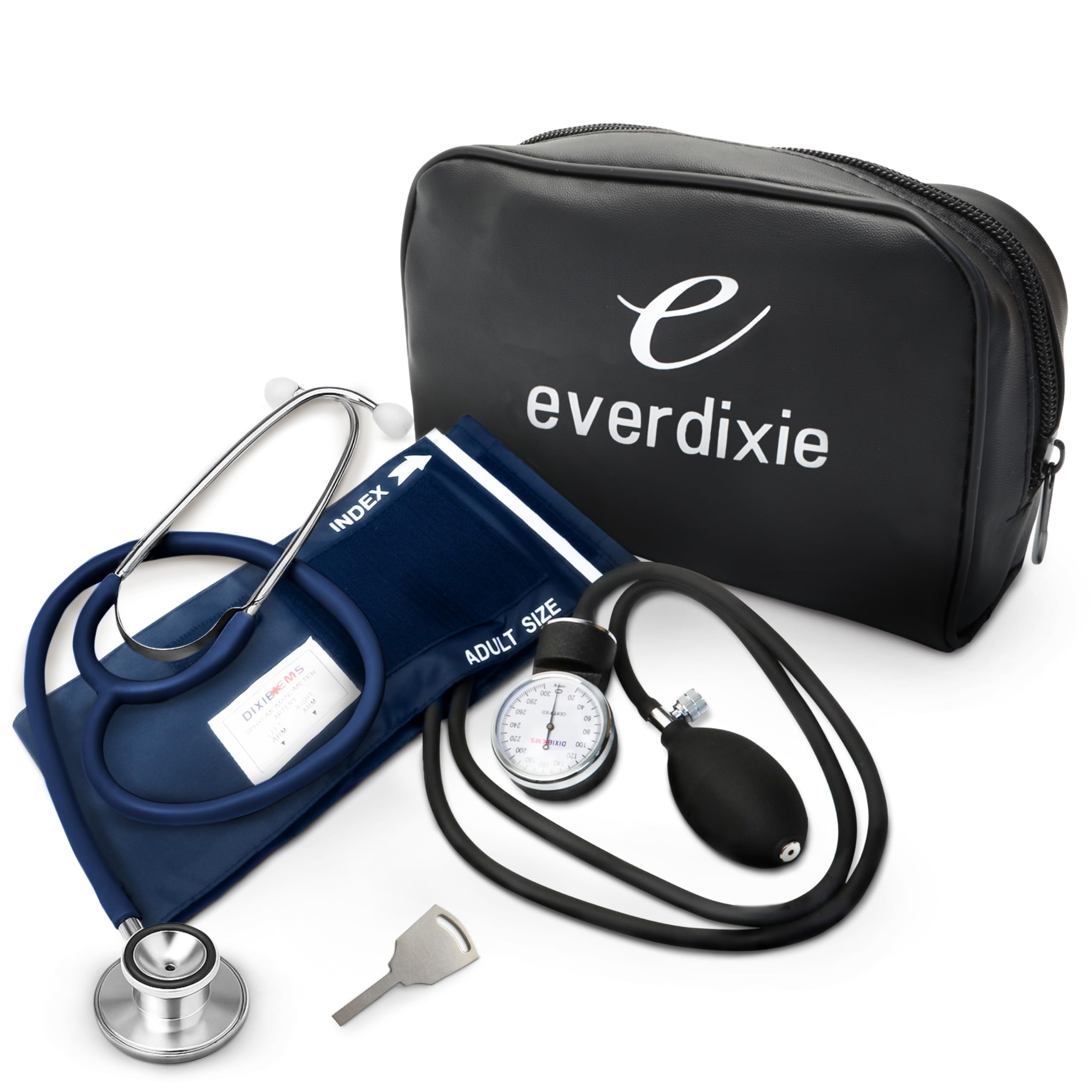 A DELUXE KIT PERFECT FOR DOCTORS & NURSES - Two pieces of high quality medical equipment come bundled together in one convenient package. Dixie EMS offers their high quality aneroid sphygmomanometer adult blood pressure cuff along with a sprague rappaport stethoscope. In addition, your order comes with a complete accessory kit and a deluxe carrying case. LATEX FREE BLOOD PRESSURE CUFF - Designed to fit adult arms between 10" and 16" in circumference. The PVC inflation bag allows for both precise and rapid thanks to its two types of air release valves; screw type & push type. So convenient, it can be operated easily with a single finger or thumb. HIGH CONTRAST & EASY TO READ DIAL - The high contrast dial on the aluminum alloy manometer allows the use to easily read blood pressure measurements with quality and accuracy. The dial features a sturdy clip that attaches to clothing or belts when not in use. DUAL-HEAD SPRAGUE STETHOSCOPE - Designed for patients of all ages, the sprague stethoscope is great for nurses, doctors, and medical students looking for a high quality stethoscope. The eartubes are designed to be flexible and adjustable to ensure the most comfortable possible fit for the user, and the extra earpieces provided can be swapped out for a custom fit. CARRYING CASE INCLUDED - The convenient carrying case will keep your equipment secure when not in use. The zippered design is secure and water resistant, allowing you to transport your equipment easily.
