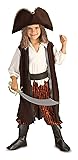 Hat with attached yarn hair and jumpsuit with attached vest, belt and boot tops Look to Rubies for costume swords, hooks, pistols and all your favorite pirate gear Child's medium is an 8 to 10, up to 54 inches tall with up to 30 inch waist and 32 inch chest Great for party time, fun time or Halloween Rubie's Costume Company has been bringing costumes and accessories to the world since 1950