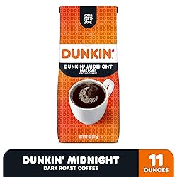 CONTAINS: One 11-oz. bag of Dunkin’ Midnight ground coffee DARK ROAST COFFEE: Full-bodied and intense flavor VERSATILE: Brew this ground coffee with whatever method you’re feelin’ DUNKIN’ TASTE, YOUR PLACE: An easy way to enjoy delicious coffee at home MAKE YOUR OWN FUN: Sip it as-is or use it for your favorite coffee recipes