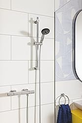 - Metal wall escutcheon with Grohe QuickFix with concealed escutcheon and shaft seal, concealed fixing, can be aligned laterally by ± 6 ° Ultra-slim design for more shower space and almost endless design options SmartControl: On / Off by pressing a button and volume control by turning with interchangeable symbols Included in delivery: overhead shower with shower arm, hand shower, shower hose, wall elbow, triple thermostat battery, mounting hardware, user manual. Rapido Smartbox (35600000) is included in the delivery.