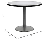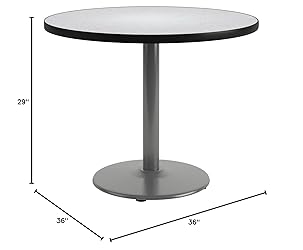 1.25" thick high pressure laminate top that's durable and easy to clean Attractive black T-Mold edge that won't crack or peel and helps protect the table from bumps and dents. Solid cast iron round base is powder-coated in silver to give it an attractive appearance. Steel column in the base has a 3" diameter and is made of 16 gauge steel for stability Leveling glides to prevent the table from wobbling on uneven floors. Easy to assemble. Top and base ship in one box. Made for Commercial Use and GSA Approved.