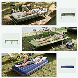 Other Imported Camping Combo: The tent cot includes a standard tent, comfortable camp bed and pillow, air mattress and matching cover, foot pump, sleeping bag, all these in one set, and easy-to-carry bag for casual transport. Separate Use: This all-in-1 camping cot tent can be used together, or you can only use the detachable cot, mattress, or sleeping bag separately as you need. The elevated tent with zipper mesh can keep you dry and warm from wet ground. Comfort Camp Cot: The air mattress inflates quickly with the foot pump, and the heavy duty camping bed can hold up to 250 lbs, bring the comfort of home at your camping adventures. Tough Built: The foldable camping cot and tent made of canvas, which is durable at outdoors. The elevated tent legs are made of aluminum alloy, give you firm support. And large foot pads are designed for added stability on muddy grounds. Quick Set Up: Easy set-up makes this tent cot a must-have for camping, hiking, day trips, or sleeping on your deck.