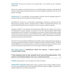Three targeted nutritional formulas (multivitamin, fish oil, antioxidant support blend) conveniently dose-packaged and providing comprehensive nutritional support.* ActivNutrients without Iron - High-quality, hypoallergenic multivitamin/mineral blend featuring activated vitamins, including folate as 5-MTHF and chelated mineral complexes in easy-to-swallow vegetarian capsules.* OmegaPure 600 EC Fish Oil - International Fish Oil Standards (IFOS) five-star certified, which assures the highest level of purity, stability, and potency in fish oils. Provides 600 mg of EPA and DHA. EPA and DHA from fish oil promote wellness by supporting cardiovascular health, cytokine balance, joint health, and brain and nervous system function.* Oraxinol ORAC botanicals - ORAC (oxygen radical absorbance capacity) is a rating developed by the National Institute on Aging to measure antioxidant capacity. The ORAC rating amount found in two capsules of Oraxinol has been shown to have the antioxidant equivalent of five to nine servings of fruits and vegetables.* Formulated to Exclude: Wheat, gluten, yeast, soy protein, dairy products, shellfish, peanuts, tree nuts, egg, ingredients derived from genetically modified organisms (GMOs), artificial colors, artificial sweeteners, and artificial preservatives.