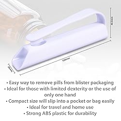 HELPING HAND: Easily remove pills from blister packaging INDEPENDENCE: Ideal for those with limited dexterity or the use of only one hand HANDY: Compact size will slip into a pocket or bag easily Ideal for travel and home use Size: For pills up to 15 by 10 mm