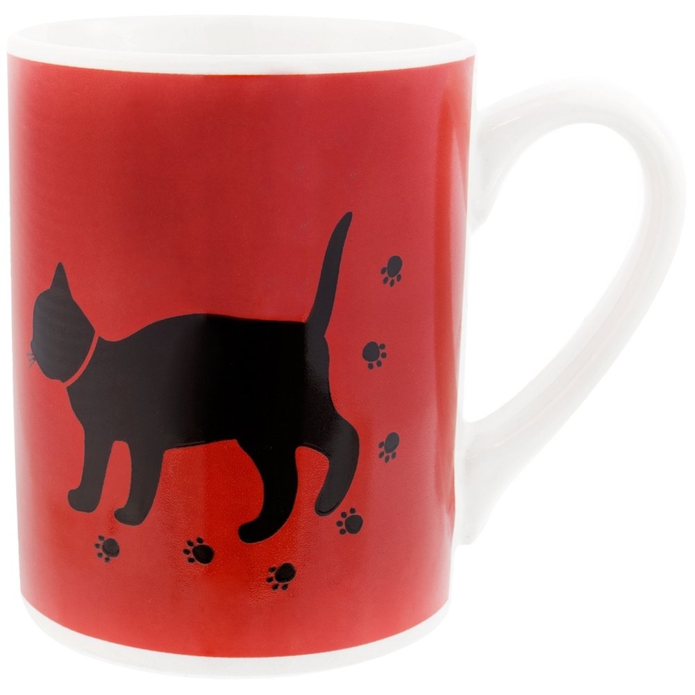 - The silhouette of a cat with a red collar gazes at a butterfly fluttering above on this white 18 oz ceramic mug. Cat lovers will enjoy starting their day with this cute and durable mug.