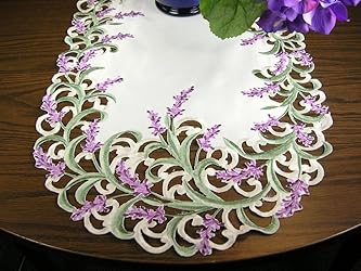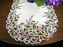 - Set your table with this beautiful Embroidered Purple Lavender Floral on White Table Runner in shades of purple and white on all edges. The Runner comes in 14" X 34" oval and is all 100% Polyester machine wash ‘ dry. Sizes may vary with cut work pattern. Order and enjoy on your Dining Room or Kitchen Table or on a Sofa Table behind your couch or in the bedroom on your single, double, or triple dresser or your nightstand. Many ways to arrange them in your home. Keeps your furniture scratch free for many years. Linens, Art and Things want to bring excitement and functional decor to your home at affordable prices and offer great gifts for your guest as well.
