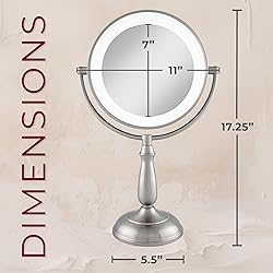 POWERFUL LED LIGHTING: The bright LED lighting allows for easy application in any lighting or setting and the eco-friendly LED bulbs never need replacing 12X DETAIL MAGNIFICATION: One side is a full view 1X reflection that’s ideal for everyday makeup and hairstyling, while the other side is a convenient 12X magnification to zoom in on every fine detail.Reflective Surface (W x H):5.5 x 5.5 inch SMART DIMMER CONTROL BASE: Tap the base to turn the light on and off, Hold and slide finger across the base to adjust the dimmer, and the mirror remembers the last brightness level used. Orientation Type: Vertical CRYSTAL CLEAR REFLECTION: Zadro’s high definition optical quality glass mirror ensures the clearest reflection without distortion AC POWERED: The included 12V/1A power adapter ensures that your mirror has the juice to provide you with all of the light that you need for your routine