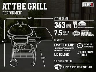 - This new take on the classic Weber Performer grill has a space-saving design and exceptional maneuverability. A sturdy painted metal table is right at hand while grilling, but folds down for convenient storage or when not in use. The grill is outfitted with innovative heavy-duty Gourmet BBQ System cooking grates, a 2-part grate system that may be used in tandem with Weber's Gourmet BBQ System cookware collection. The Tuck-Away lid holder allows you to simply move the lid to the side to check on your meal or add charcoal. Other convenience features include an aluminized steel One-Touch cleaning system and enclosed high-capacity ash catcher. Together these make dealing with ashes and cleanup as hassle-free as possible. Lid handle features a heat shield for comfort.