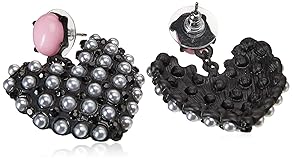 Black heart drop earrings embellished with pearls and pale pink cabochon accent at top. Earrings are set in black plated metal with a post back closure. Black-plated metal with plastic Length: 1.5" Width: 1.1" Post back closure Imported